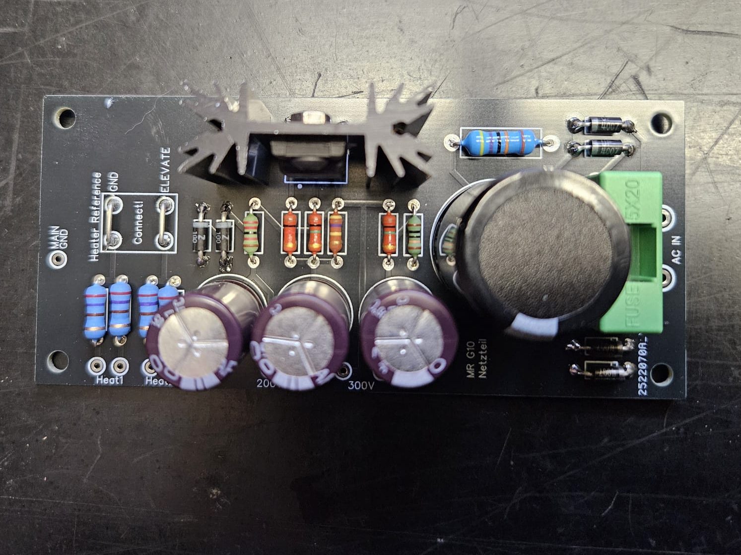Herzstück des Netzteils ist der Mosfet-Längsregler, welcher für eine ordentliche Glättung der Hochspannung, sowie einen langsamen Spannungsanstieg sorgt. Neben einem einfachen Spannungsteiler für das Hochlegen der Heizspannung ist noch eine 200V-Abzapfung mittels Zenerdiode (2x100V bei je 1,3W) angefügt, da nicht alle Röhren in der Vorstufe mit der vollen Spannung von 300V versorgt werden.