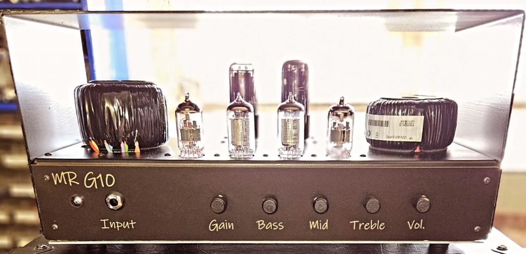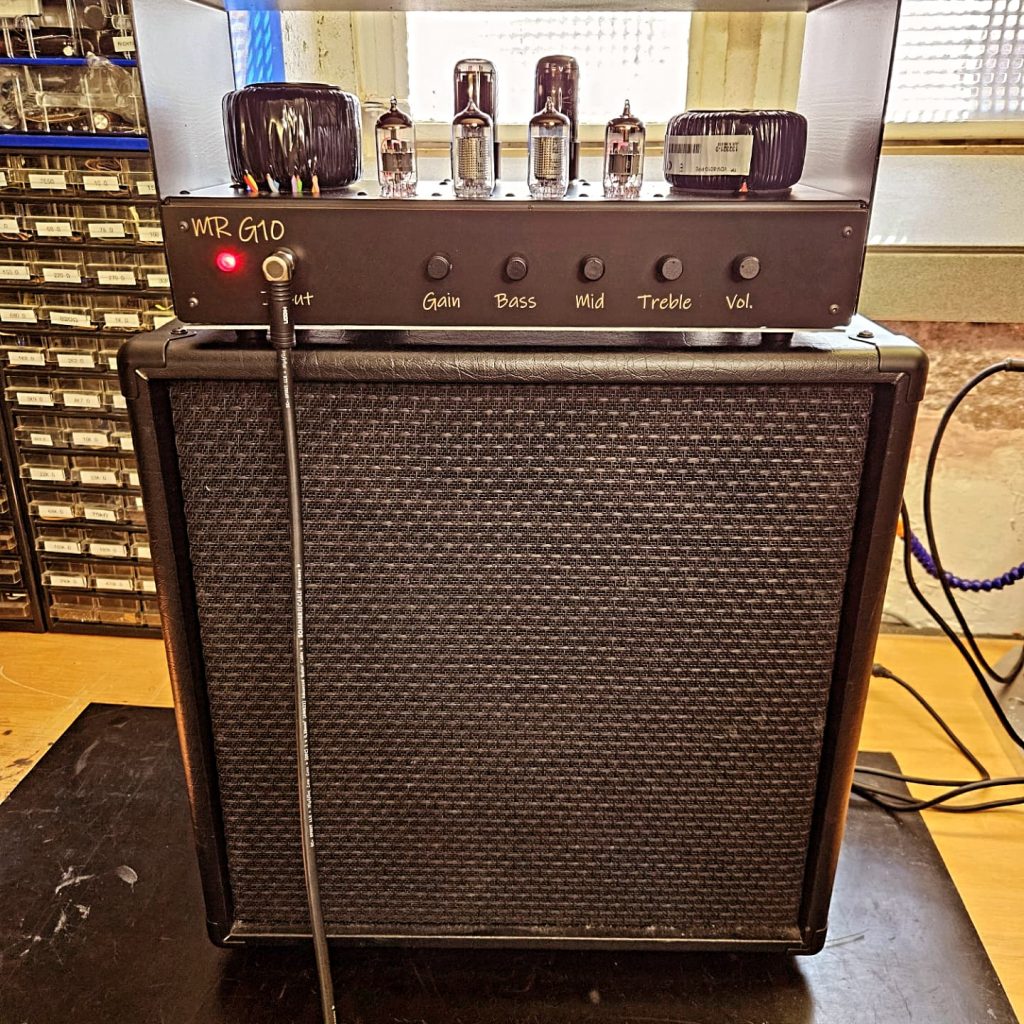 Der MR G10 ist mein erster heavy Gitarren-Röhrenverstärker für Musik der härteren Gangart. Er besteht aus einem Kanal, der mithilfe von zwei EF86-Pentoden den typischen Pentodensound bereits in der Vorstufe erzeugt. Die 6V6-PP-Endstufe liefert eine Ausgangsleistung von 10W. Dieser Verstärker ist minimalistisch gebaut und fokussiert sich auf einen ausgewogenen und echten verzerrten Sound, der vor allem für tiefergestimmte Gitarren oder 7-Saiter geeignet ist.