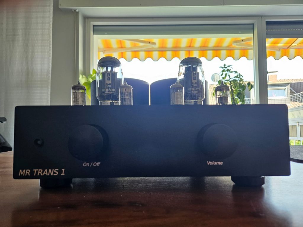 Der MR Trans 1 bzw. HF15 ist mein stärkster Verstärker und ein wahres Monster. Mit einem Gewicht von ca. 15kg und einer Leistung von 15W pro Kanal ist dieser Verstärker mühelos in der Lage, einem die Ohren blutig zu lärmen. Der Name Trans 1 rührt daher, dass dies mein erster Trans-Röhrenverstärker ist. Das Prinzip der Trans-Schaltung ist hierbei jedoch nicht meine Erfindung, sondern das Ergebnis jahrelanger Forschung von Herrn Vanderveen. Genauere Informationen und Erklärungen hierzu findet man auf seiner Webseite www.mennovanderveen.nl.