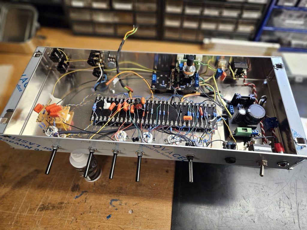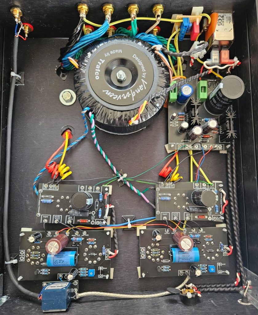 So sieht einer meiner Verstärker von innen aus. Alle Kabel sind befestigt oder starr, sodass sie an ort und Stelle bleiben. Alle Wechselspannungsleiter sind verdrillt. Die Signalleiter sind zusätzlich geschirmt.