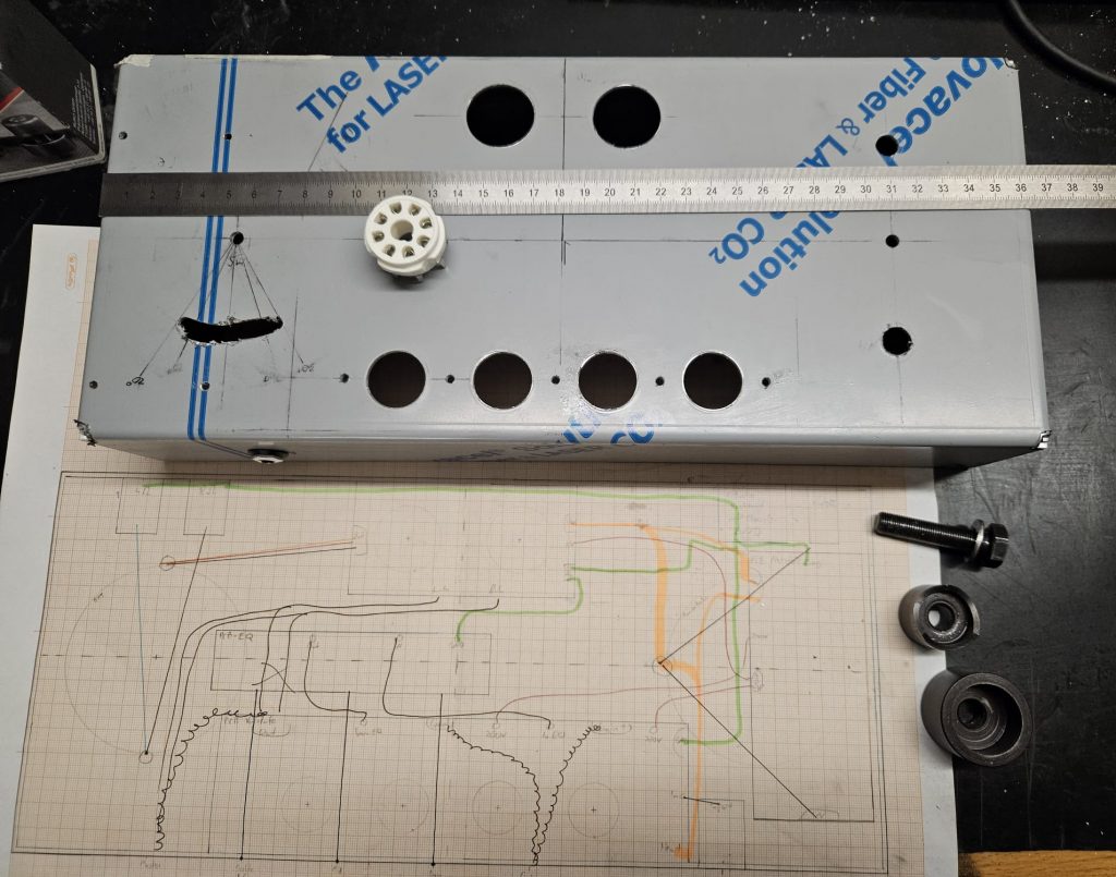 Falls noch eine Röhre oder ein Potentiometer mehr benötigt wird, dängel ich ein zusätzliches Loch einfach mit Akkuschrauber ins Gehäuse.