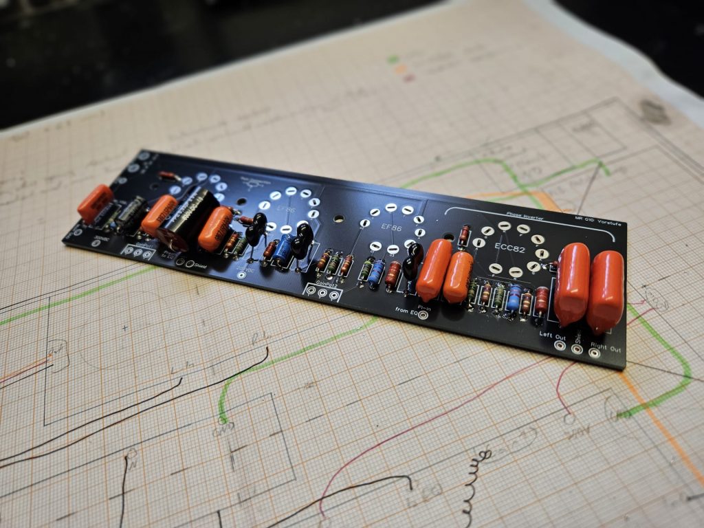 Nun kann ich die PCBs bestücken. Die Erfahrung hat gezeigt, dass die Röhrensockel erst verlötet werden sollten, sobald das PCB verschraubt ist. So kann ein gewisses Spiel zwischen PCBs und Bohrungen genutzt werden, damit auch wirklich alles zusammenpasst und nichts schief sitzt oder sich behindert.